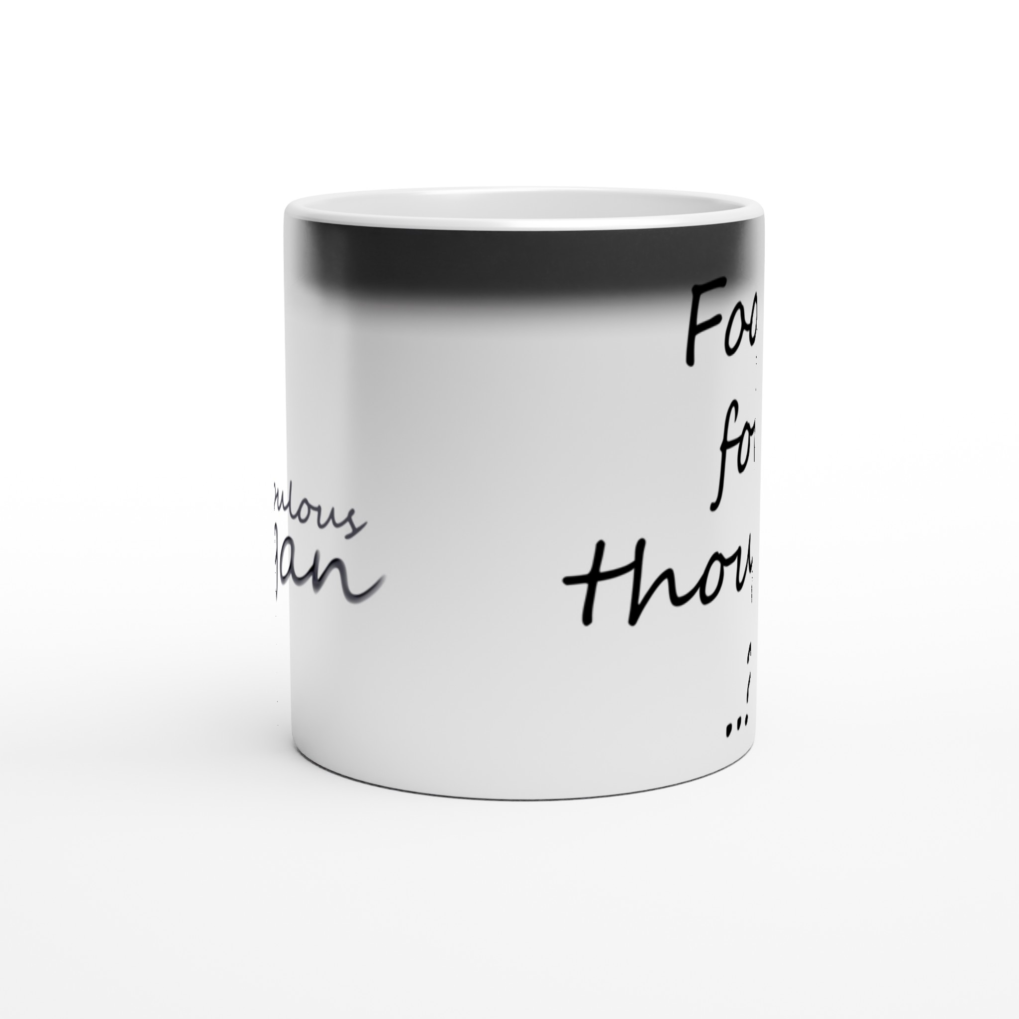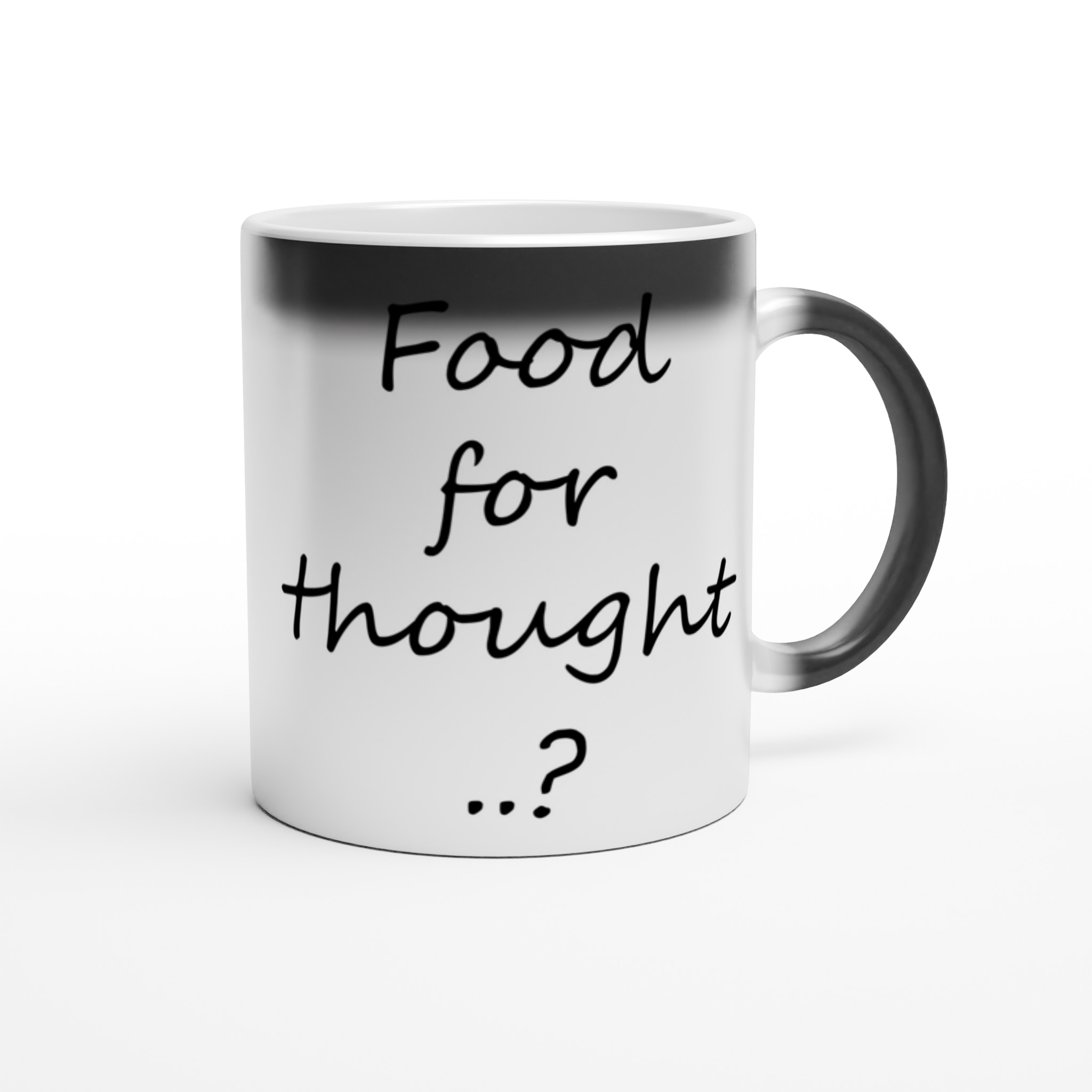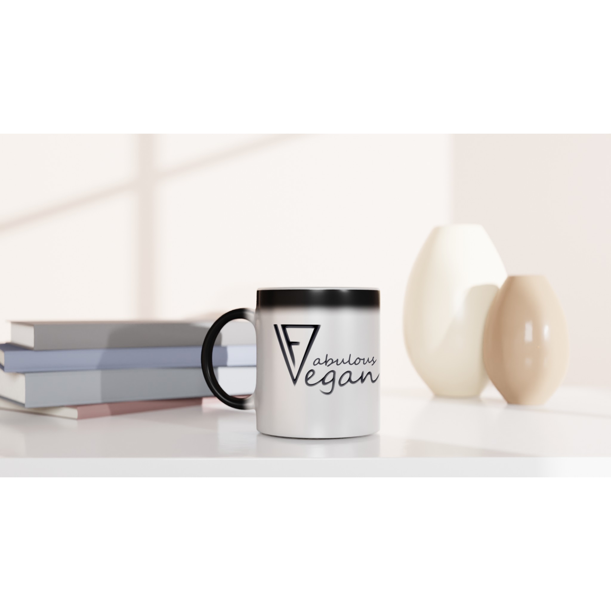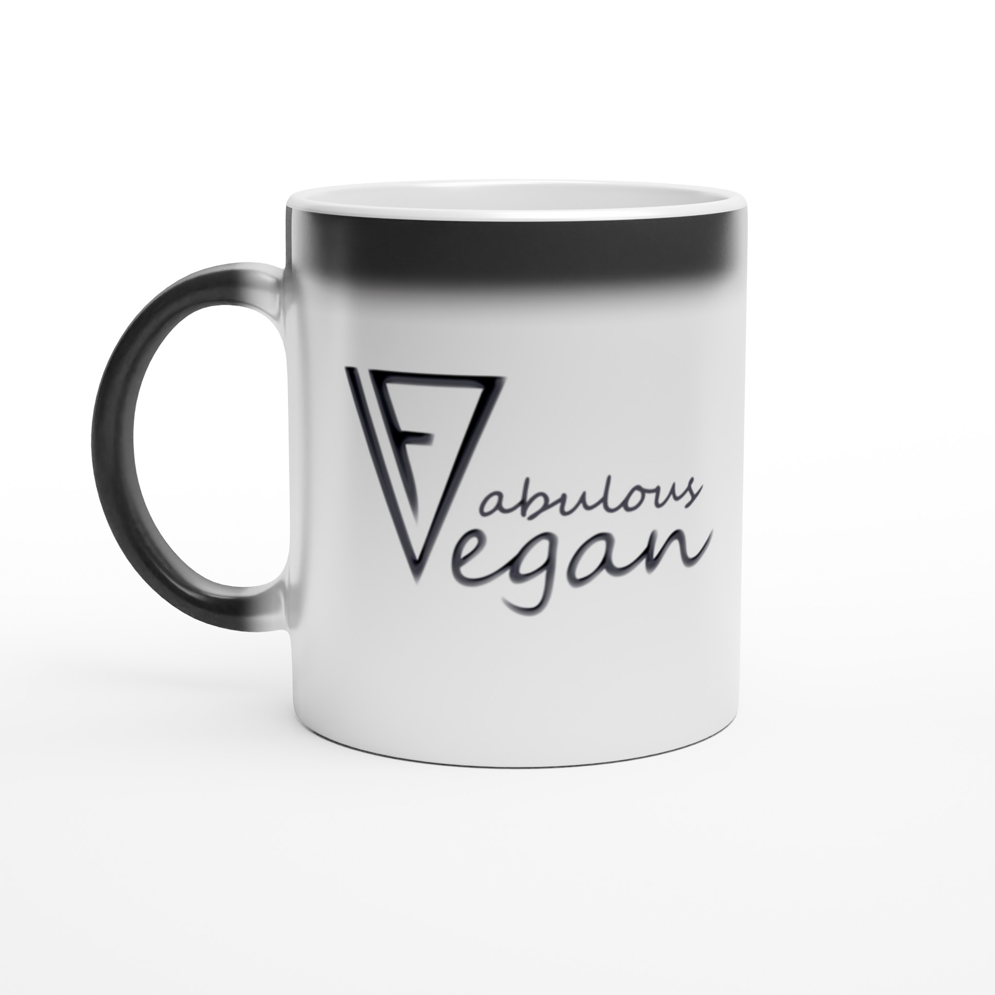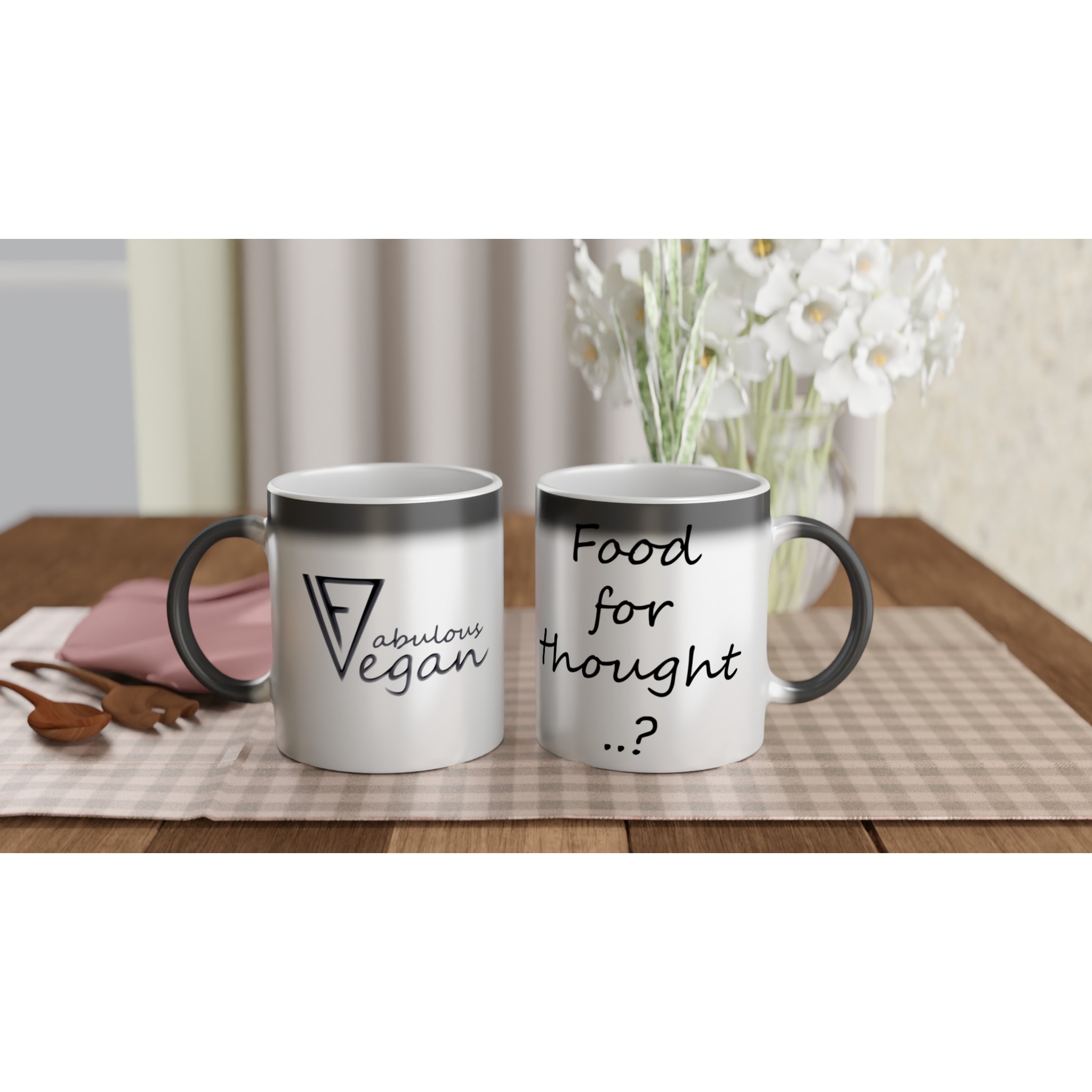 This mug has a black glossy finish when it’s empty. When a hot beverage is added, the mug reveals the VeganFabulous logo and “Food for thought ..?” slogan.